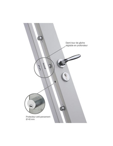 Pour la serrure c'est une serrure toute hauteur avec 5 points de fermeture incluant le demi tour qui se condamne lorsqu'on verrouille la porte.