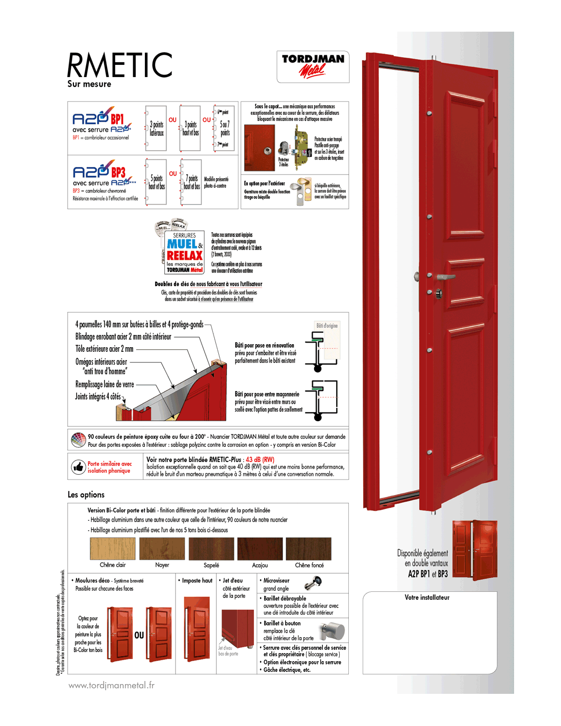 - Isolation : laine de verre à l’intérieur + joints 4 cotés intégrés à l’huisserie (pas de risque de décollage)