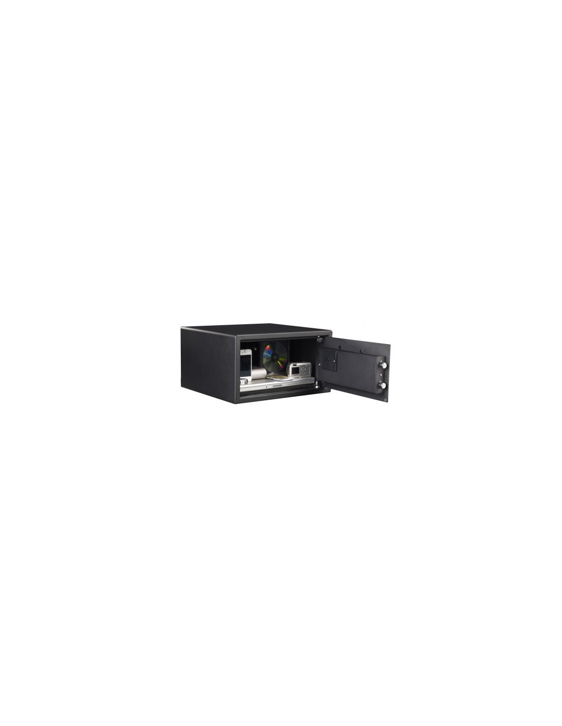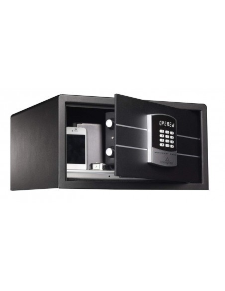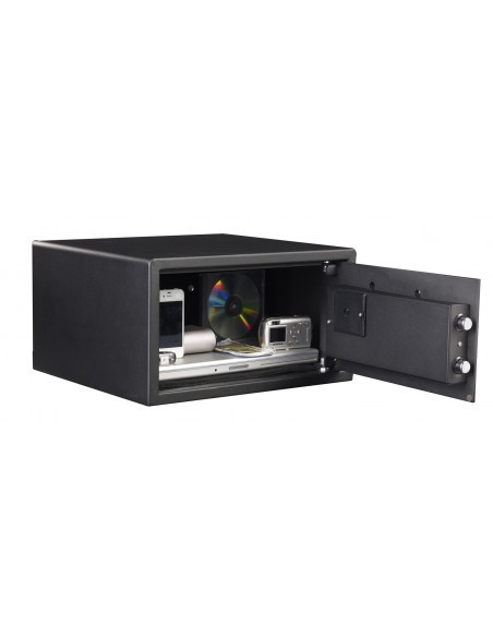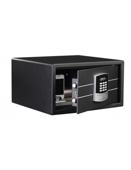 Caractéristiques du coffre-fort : - Coffre-fort pour hôtel et hôpital. - Pour PC 15 pouces ou documents. - Serrure électronique. - Code maître et Code utilisateur. - Dim. externes : 230 (H) x 420 (L) x 380 (P) mm. - Capacité : 36 litres