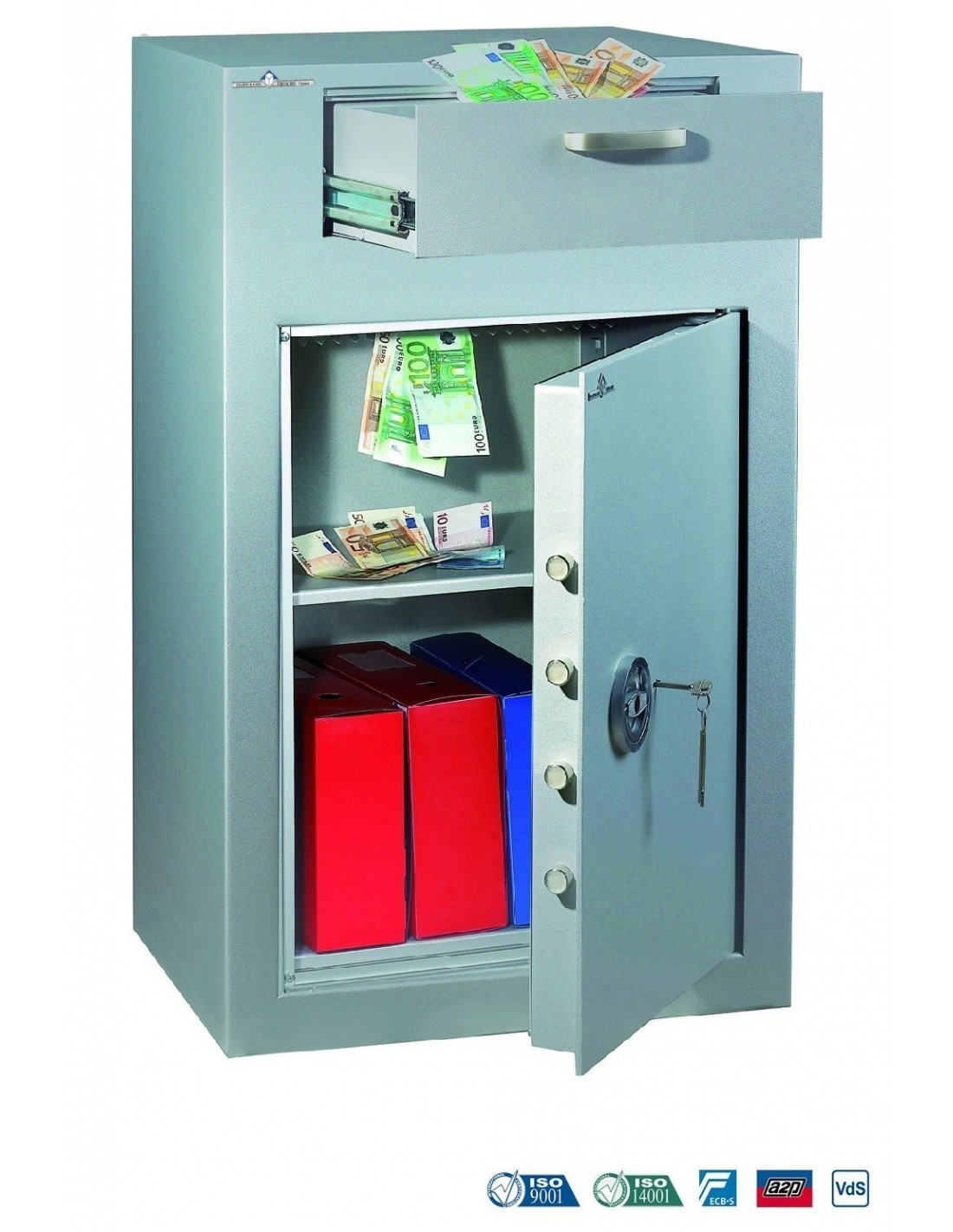 En effet ,le modèle , Hartmann l’a soumis aux règles de la norme Allemande VDMA niveau B. Cet équipement robuste construit en acier 1er choix avec parois défensives de forte épaisseur qui sont capables de résister au feu et aux attaques par effraction grâce à sa porte.