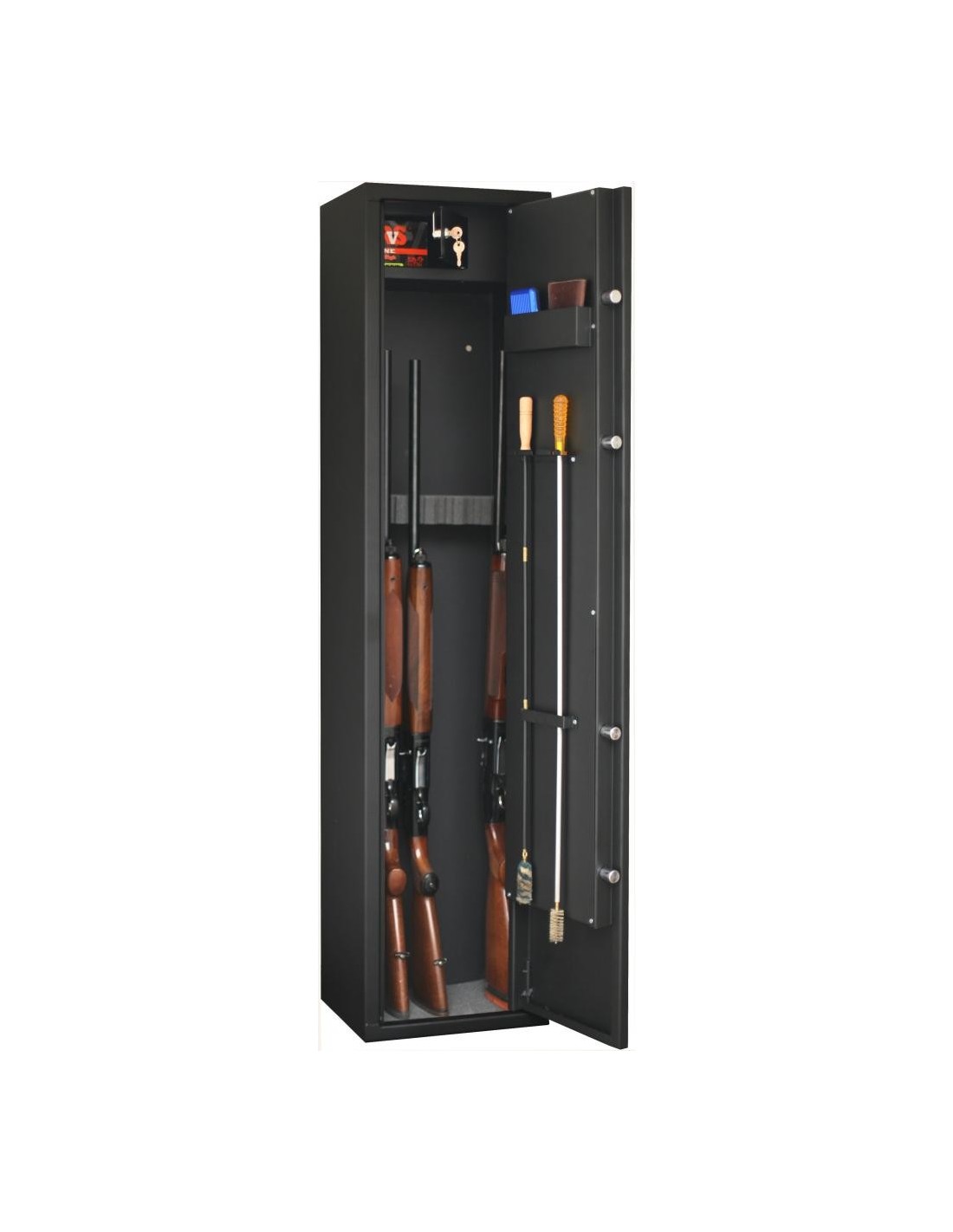1 coffre en partie haute (2 clés fournies) / rangements pour accessoires dans la porte.
