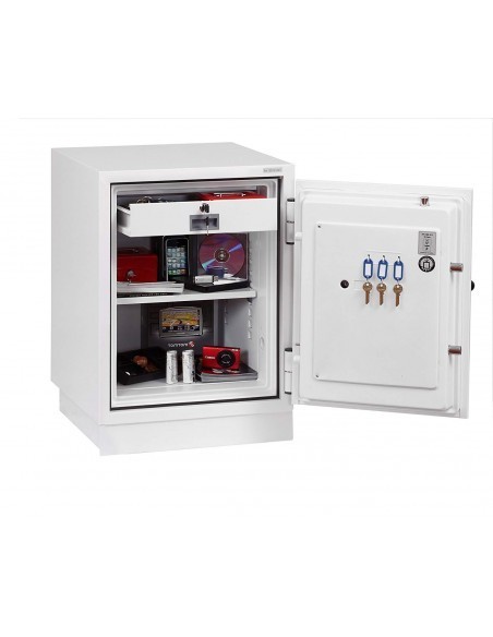 Dans le but de garantir une protection optimale, le coffre fort phœnix fire fighter fs0441f est testé par MTC - DIP120 - 60DMA norme au feu, fourni 60 minutes de protection contre le feu pour médias numériques, DVD, clefs USB et cartes mémoire.I l est équipé d’une serrure électronique de haute sécurité facile d’utilisation R3 avec un écran LED clair. Afin de renforcer la sécurité la serrure dispose également d’un double contrôle, code caché et code brouillé avec 128 empreintes digitales