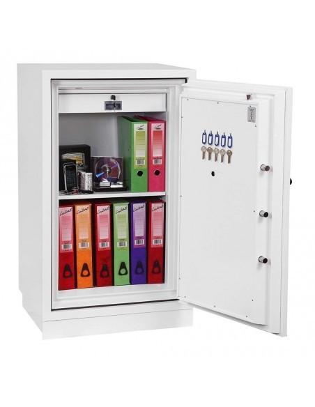 Dans le but de garantir une protection optimale, le coffre fort phœnix fire fighter fs0443e est testé par MTC - DIP120 - 60DMA norme au feu, fourni 60 minutes de protection contre le feu pour médias numériques, DVD, clefs USB et cartes mémoire.Il est equipé d’une serrure électronique de haute sécurité facile d’utilisation R3 avec un écran LED clair. Afin de renforcer la sécurité la serrure dispose également d’un double contrôle, code caché et code brouillé.