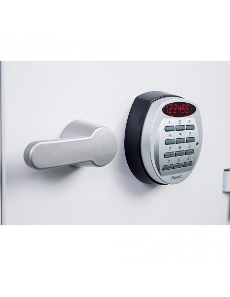 En effet ,le modèle TITAN, Phoenix l’a soumis aux règles de la norme International Standard NT FIRE 017 60. Cet équipement robuste construite des plaques en acier galvanisé est capable de résister au feu et aux attaques par effraction grâce à sa porte incurvée encastrée et étanche à l’air avec une serrure électronique de haute sécurité de pointe avec affichage LED clair. Afin de renforcer la sécurité du coffre fort phœnix titan fs1283e, sa serrure dispose également d’ un double contrôle, code caché et code brouillé.