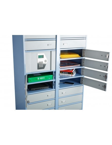 Dans le but de garantir une protection optimale, l'armoire forte phœnix SL0024 est équipée d'un verrou électro-mécanique, commandé depuis le terminal du SL0024E, doté d’un affichage à cristaux liquides et d’un code PIN à 4 chiffres ou d’une carte RFID. Équipée d'une barre de verrouillage centrale (2 clés fournies) pour l'accès technique et la gestion des casiers.