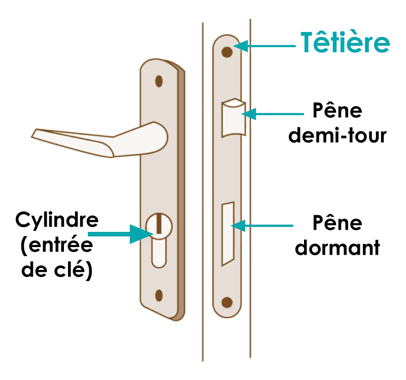 Poignée : C’est l’organe qui permet de bloquer ou de débloquer le pêne dormant et donc de déverrouiller ou de maintenir le verrouillage de la porte..