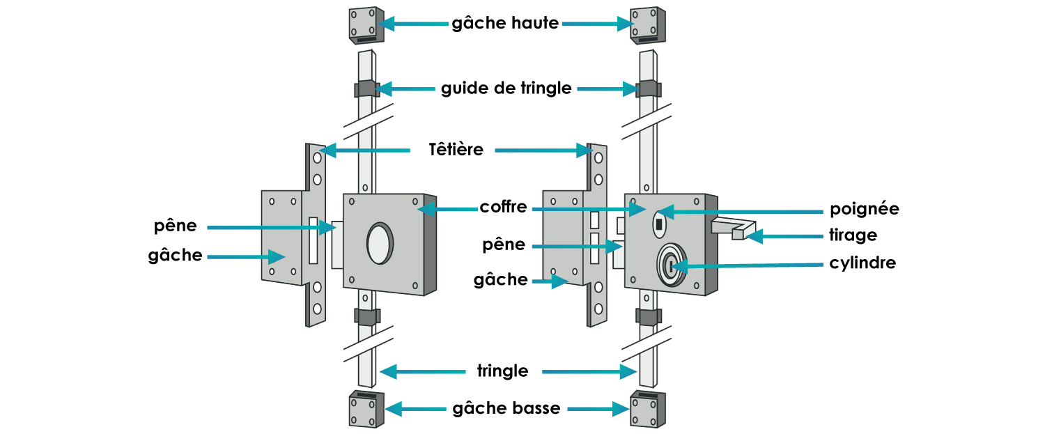 Têtière : la têtière ou tringle est le mécanisme de la serrure présent sur la tranche de la porte. Elle est visible sur les portes à verrouillage multi-points.