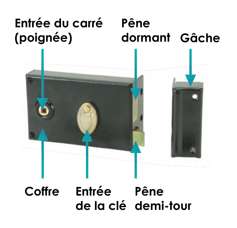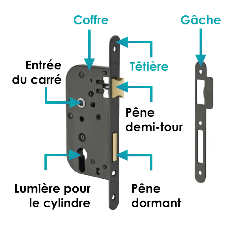 Gâche :C’est le boitier où se loge le pêne pour permettre le verrouillage de la porte.
