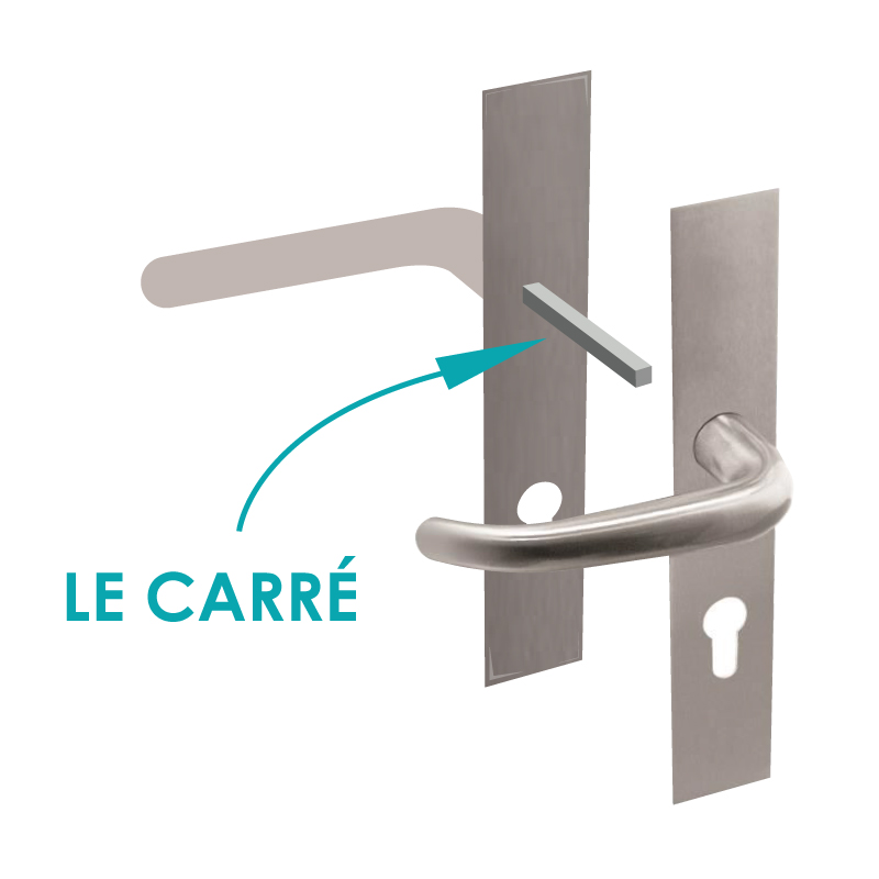 Carré : C’est la pièce qui traverse la porte et assure l’entrainement du pêne suite à une manipulation de la poignée. Sa dimension est standard et peut être de 7.6 ou 8mm.