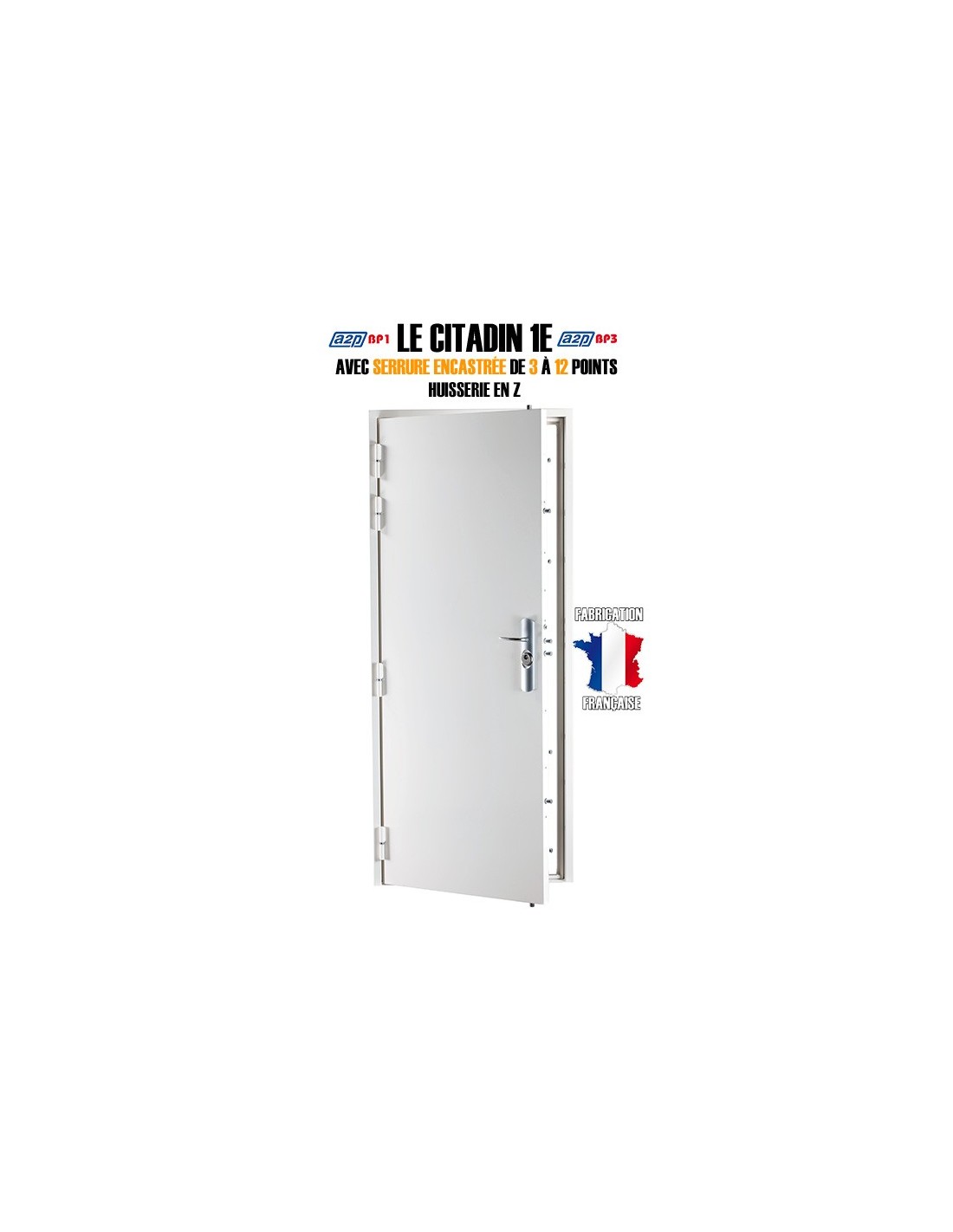 Le blindage de porte est composé d'une enveloppe en tôle plié acier de 20/10ème, 4 paumelles de 140mm sur butée à billes.