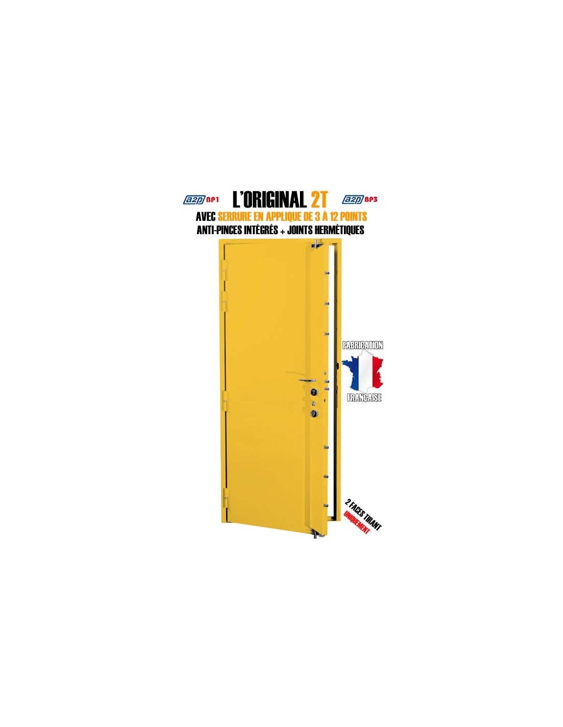 L'ORIGINAL 2T est un bloc-porte blindé doté d'une serrure carénée en applique et de deux faces blindées en acier.