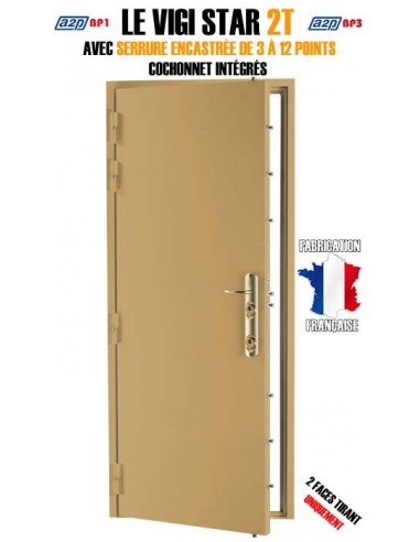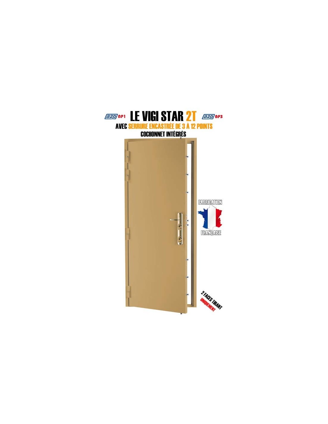 LE VIGI STAR 2T est un bloc-porte blindé doté d'une serrure carénée encastrée et de deux faces blindées en acier.