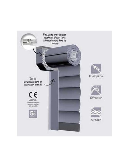 Une fois déroulé, QOMPACT® garantit une robustesse à toute épreuve. En effet, chaque lame du tablier est retenue dans les coulisses par un système anti-tempête, ce qui lui confère une excellente résistance à l’effraction (test A2P en cours) et aux vents même violents. Ses différents composants étant en aluminium extrudé, QOMPACT® n’est pas altéré par l’air salin. Un joint double lèvre offre une étanchéité renforcée pour votre porte.